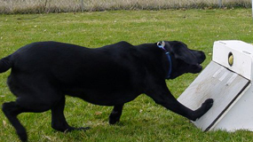 und einer Flyballmaschine. Der Hund versucht beim Flyball möglichst